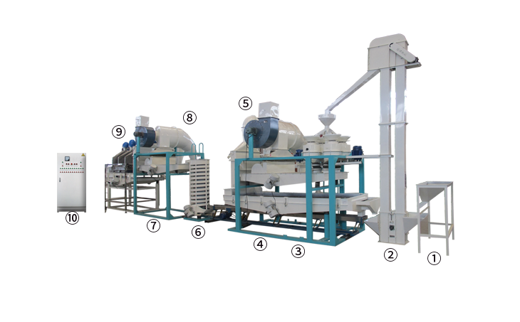 ① input hopper ② bucket elevator ③ main part of the equipment(dehuller,air separator and seed-kernel separator) ④ leaf-spring conveyor ⑤ vertical air-separating system ⑥ spiral elevator ⑦ vibrating air-separator ⑧ vertical air-separating system ⑨ electrostatic air separator ⑩ electric control cabinet