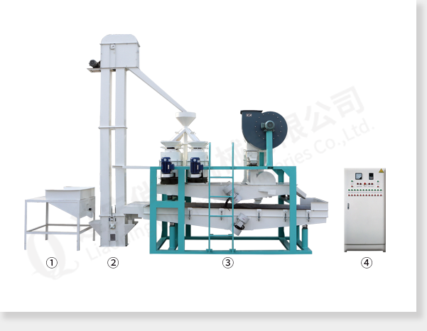 ① 上料斗② 斗式提升機 ③ 脫殼、風(fēng)選、分選主機 ④ 電氣控制柜